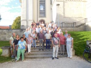 Bei schönstem Ausflugswetter erreichte die Reisegruppe des Heimatkundlichen Vereins Schwendi im nahezu vollbesetzten Bus ihr erstes Ziel: Oettingen im Ries. Die Sonderführung im Residenzschloss der Fürstenfamile Oettingen-Spielberg befasste sich vor allem mit dem segensreichen Wirken der Gräfin Johanna von Schwendi. Johanna hatte im Jahr 1689 den Grafen und späteren Reichsfürsten Franz Albrecht zu Oettingen-Spielberg geheiratet und zahlreiche Projekte im Schloss und in der Stadt Oettingen initiiert, darunter den Bau eines Spitals. Durch die Unterstützung der Armen und Kranken blieb sie bis in unsere Zeit hochgeachtet und verehrt. Auch ihrer Heimatgemeinde Schwendi fühlte sie sich lebenslang verbunden. Die Kirche St. Stephanus in Schwendi wurde zu ihrer Regierungszeit von Grund auf erneuert, die Kirche Maria Magdalena in Großschafhausen ganz neu errichtet. Ihr ältester Sohn übernahm als regierender Fürst die Grafschaft Oettingen, der Zweitgeborene bekam als Apanage die Herrschaft Schwendi und einige ihrer Töchter heirateten bis in den Hochadel. Nach der beeindruckenden Führung mit vielen neuen Informationen ging die Fahrt nach dem Mittagessen weiter zum Schloss Baldern. Hierbei blieben wir im weitesten Sinn bei der Fürstenfamilie Oettingen, speziell bei der katholischen Linie Oettingen-Wallerstein, in deren Besitz das Schloss Baldern ist. Das barocke Residenzschloss Baldern liegt unweit des Nördlinger Ries, auf einer Anhöhe, die durch den Meteoriteneinschlag vor 15,8 Millionen Jahren entstanden ist. Die außerordentliche Höhenlage vermittelte einen grandiosen Rundblick insbesondere über die Landschaft und die Dörfer um die Riesebene. Zudem beherbergt das Schloss eine der größten mittelalterlichen Waffensammlungen Deutschlands, die bei der kurzweiligen Führung in vielen Einzelheiten erklärt wurde. Große Aufmerksamkeit erweckten die zahlreichen Salons und Zimmer der einstigen fürstlichen Familie, wobei die aufwändigen Stuckdecken und Ornamente besondere Beachtung fanden. Mit viel Witz und Hintergrundwissen geleiteten die beiden Schlossführer unsere Gruppe durch die prächtigen, in verschiedenen Farben eingerichteten Salons und sparten nicht mit Hinweisen auf die versteckten Gänge der Dienerschaft, die hinter den Kulissen die fürstlichen Herrschaften zu versorgen hatten. Im obersten Stockwerk war der künstlerische Höhepunkt zu bestaunen: Der Festsaal mit dem gigantischen Deckenstuck, der die damaligen vier bekannten Erdteile, die göttlichen Tugenden und die Jahreszeiten darstellt, beindruckte die Besucher ganz besonders. Damit schloss sich der Kreis mit der Geschichte und den Bauwerken der beiden Linien des hochadeligen Fürstenhauses Oettingen-Spielberg und Oettingen-Wallerstein, die in der Vergangenheit eine wechselvolle und einflussreiche Rolle in Politik und Gesellschaft gespielt haben und auch heute unternehmerisch in vielen Bereichen tätig sind. Den Abschluss des historisch geprägten Ausflugs bildete eine Einkehr im Kloster Neresheim, den viele auch zum Besuch der barocken Klosterkirche nutzten.